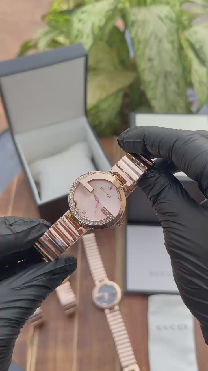 he Gucci Interlocking Ladies Watch is a stylish timepiece inspired by the iconic Interlocking G design, representing elegance and modern luxury. With its sleek dial and refined bracelet style, this watch adds a sophisticated touch to any outfit.